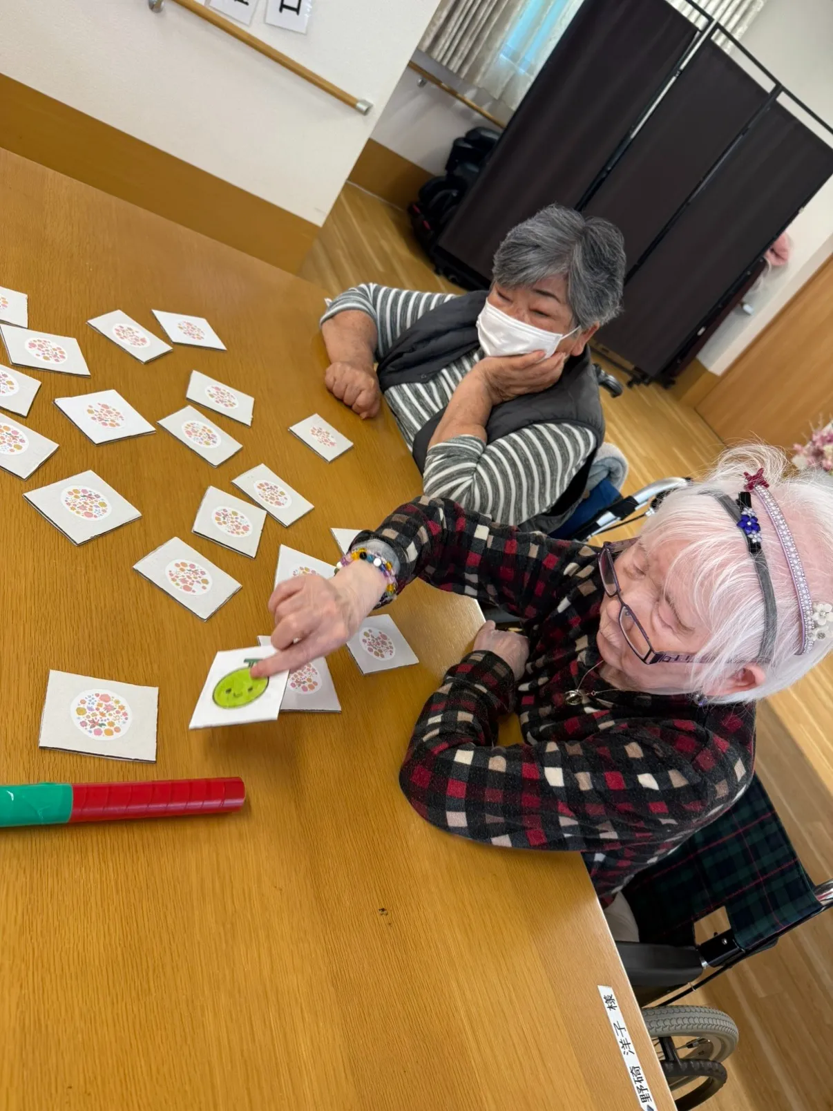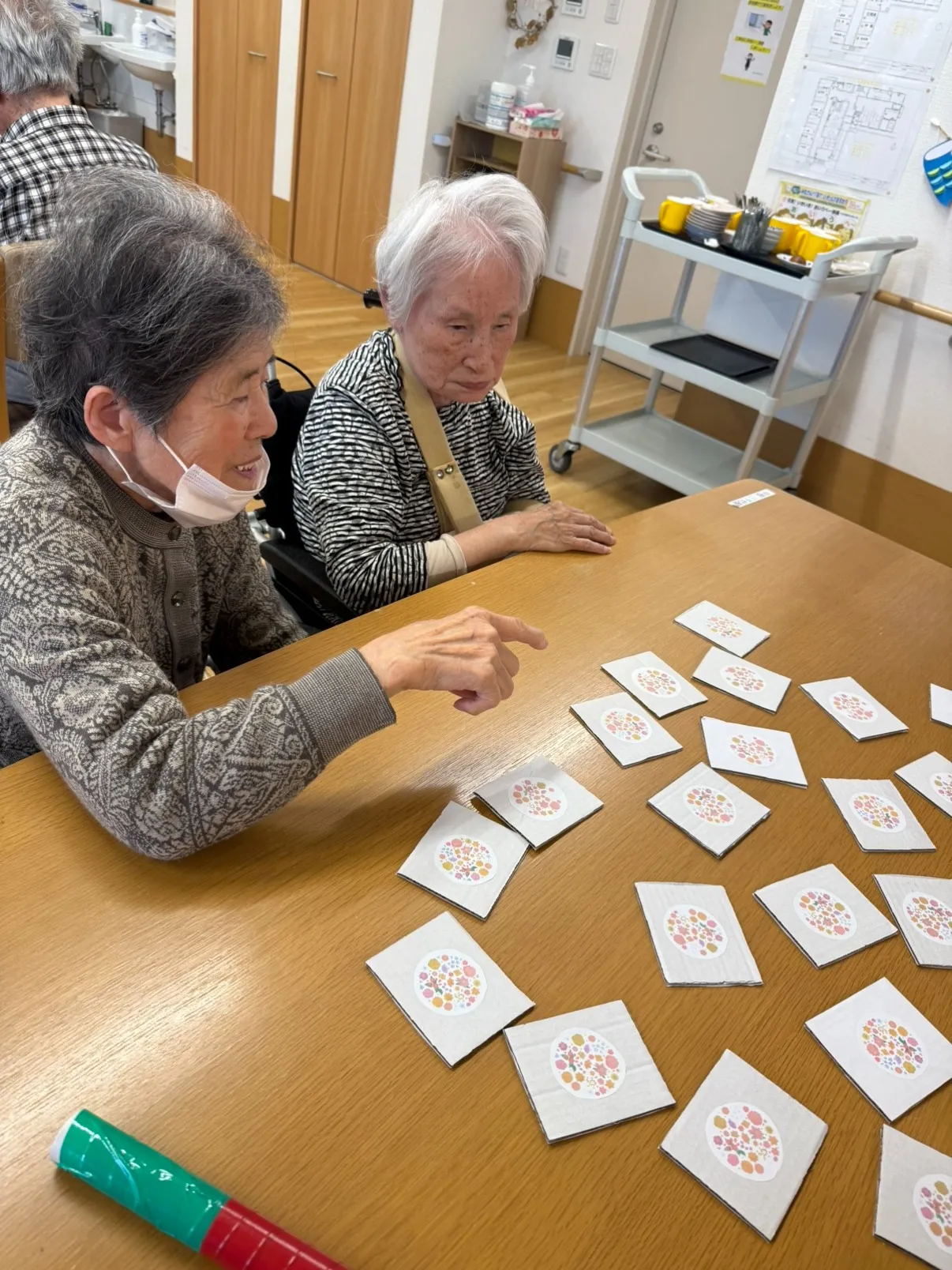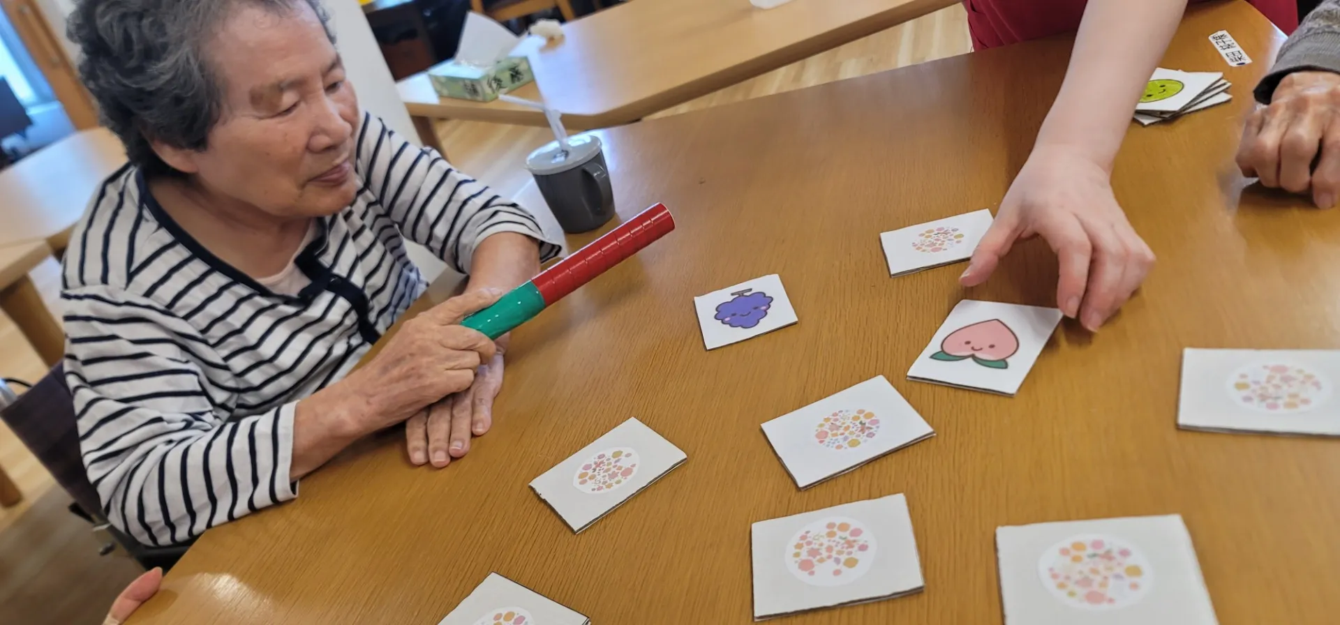 まずは1点目。皆さんが座った状態でレクリエーションをする際、手が届かない場所に関してどのように対処するかという部分です。立ち座りの動作がスムーズにいく人ばかりではありません。そのため、予め長い棒を準備しておくことで椅子から立たずとも遠い場所のカードを選択することが出来るように改善しました。